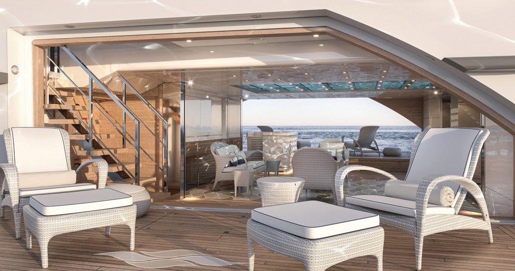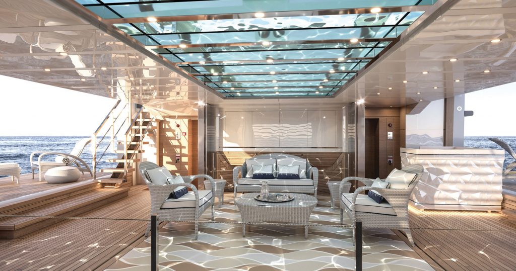 A standout feature is the unique beach club and tender garage, while the expansive glass surfaces flood the interior with natural light, accentuating the yacht’s clean, minimalist lines to foster a harmonious connection with the surrounding seascape.