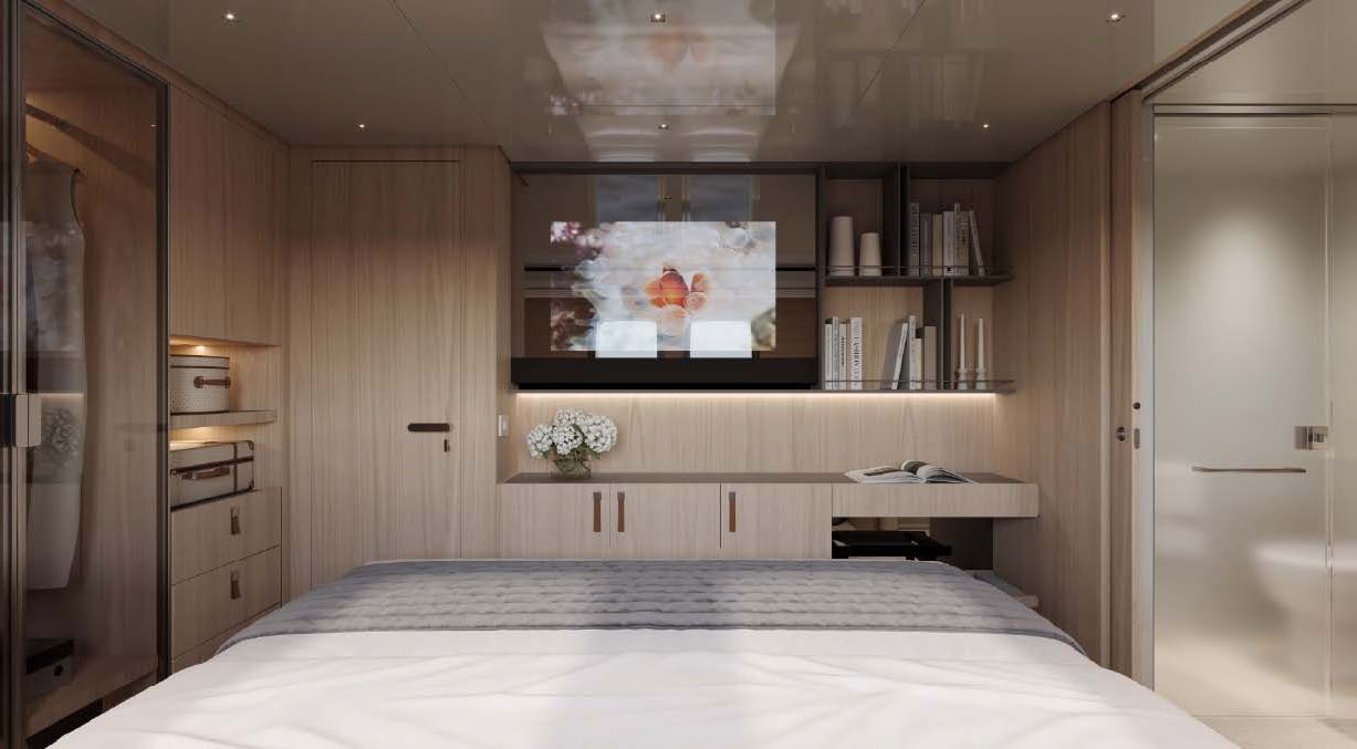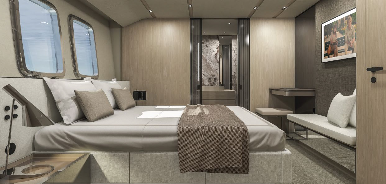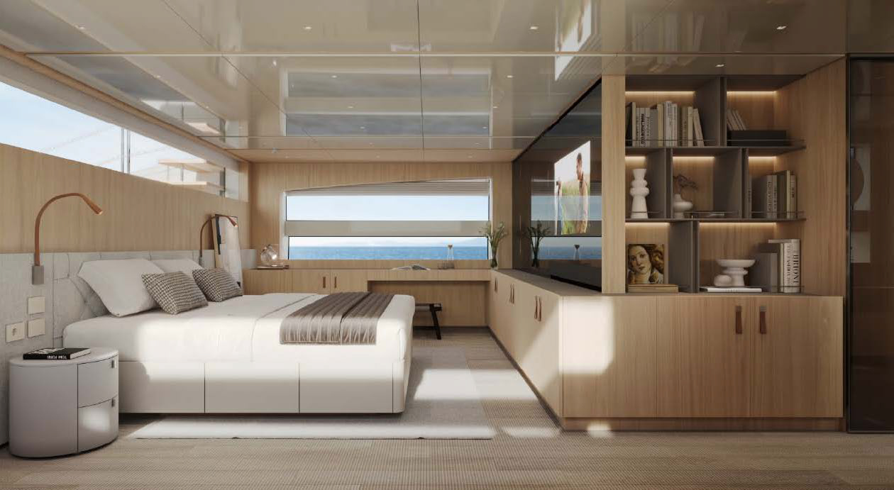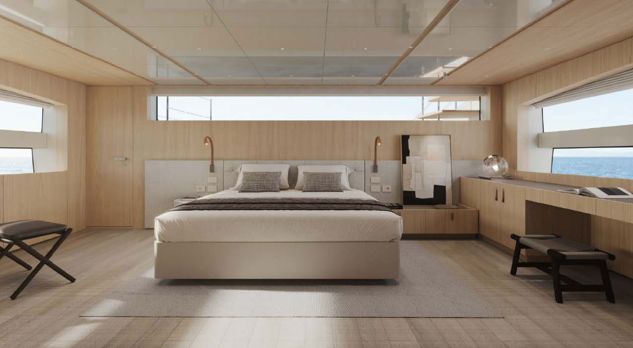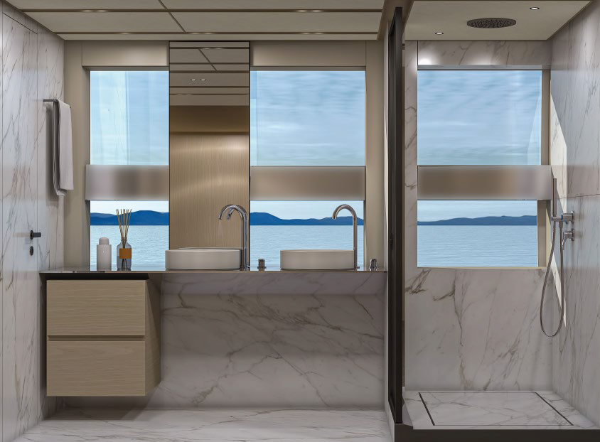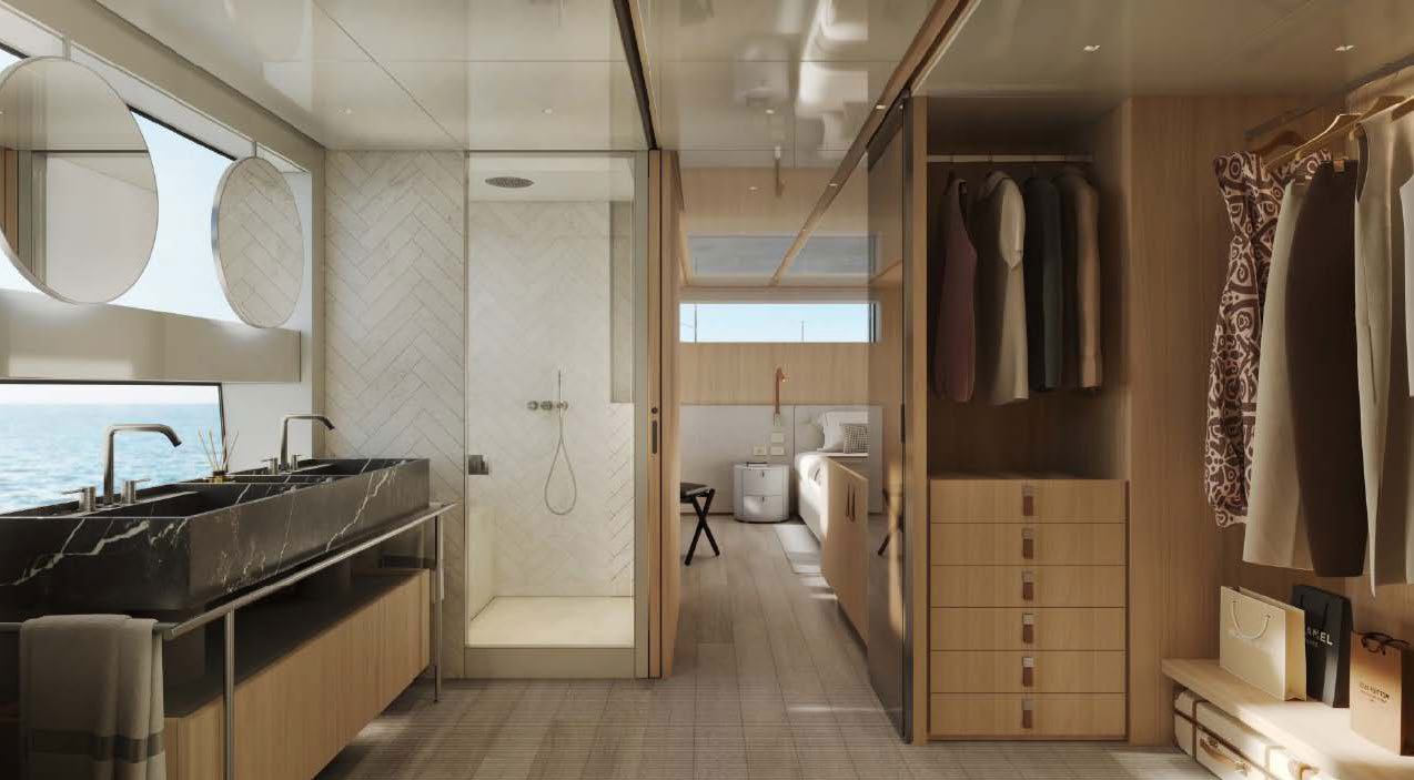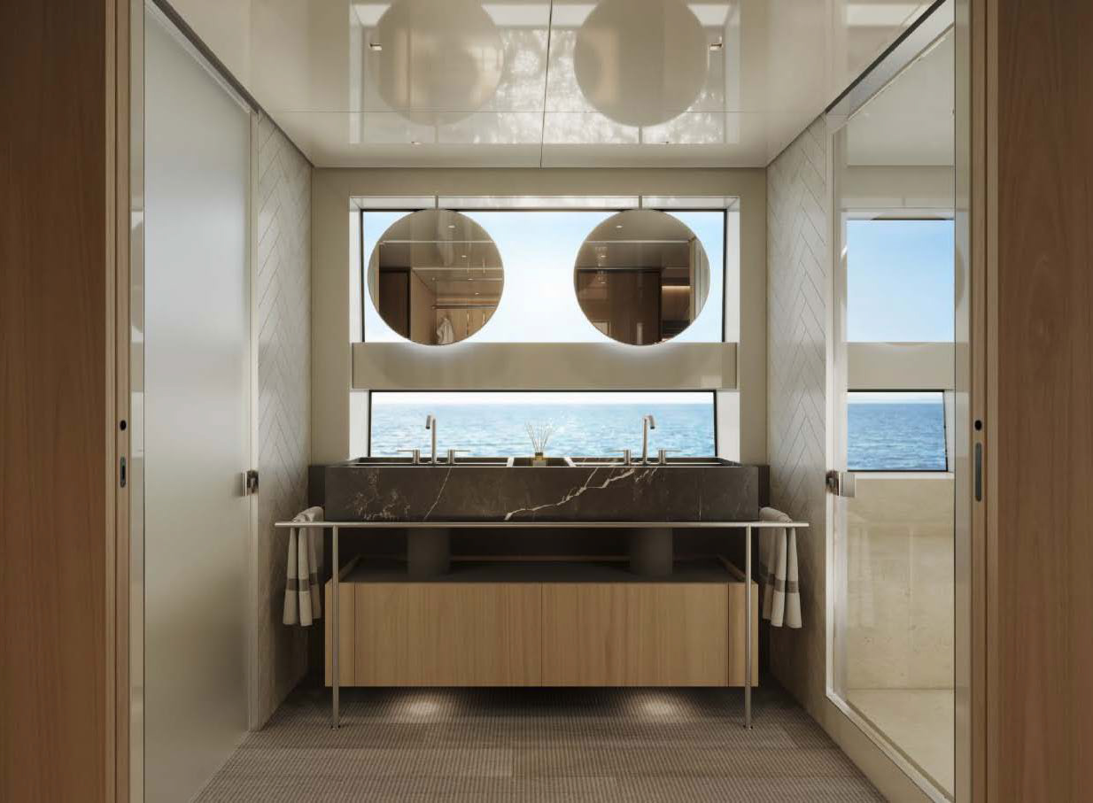 This widebody concept enhances onboard living, allowing the SL110A to accommodate ten guests across five generous cabins. Among them is an expansive, light-filled full-beam owner’s cabin, which offers stunning 270-degree views through the full-beam and side window.