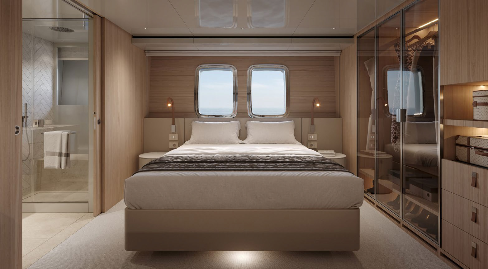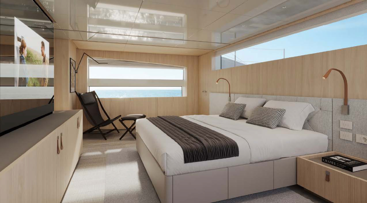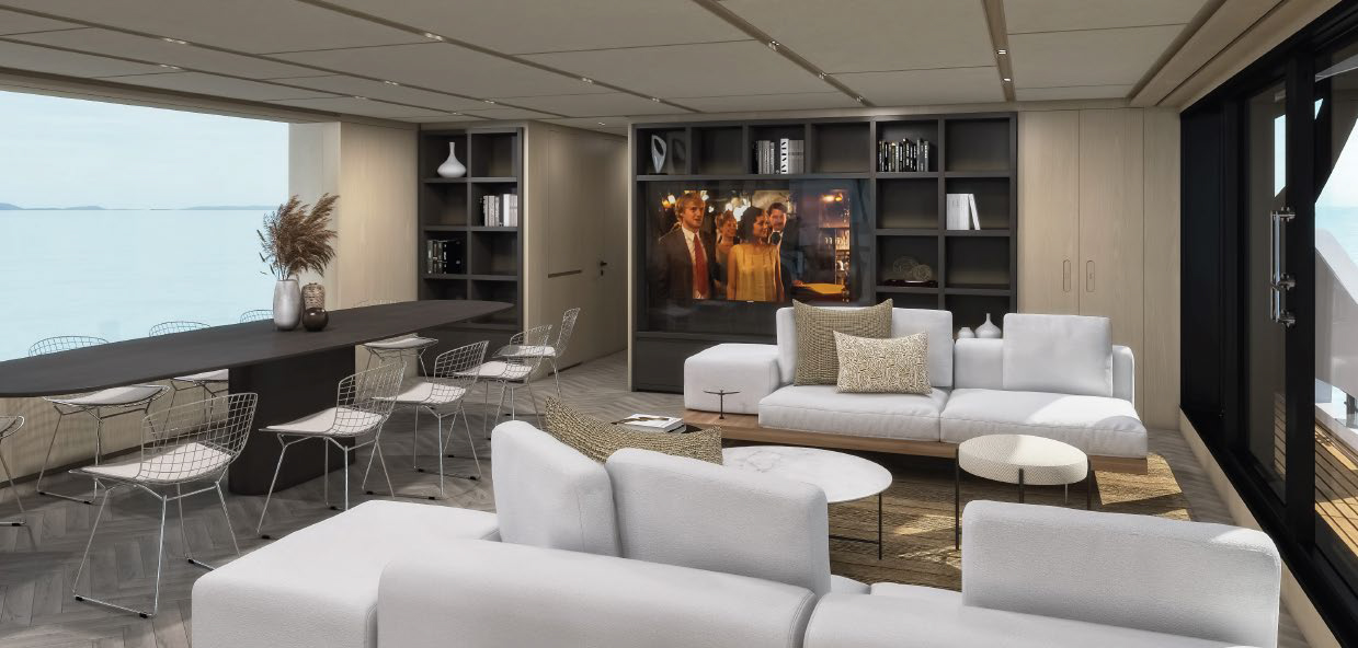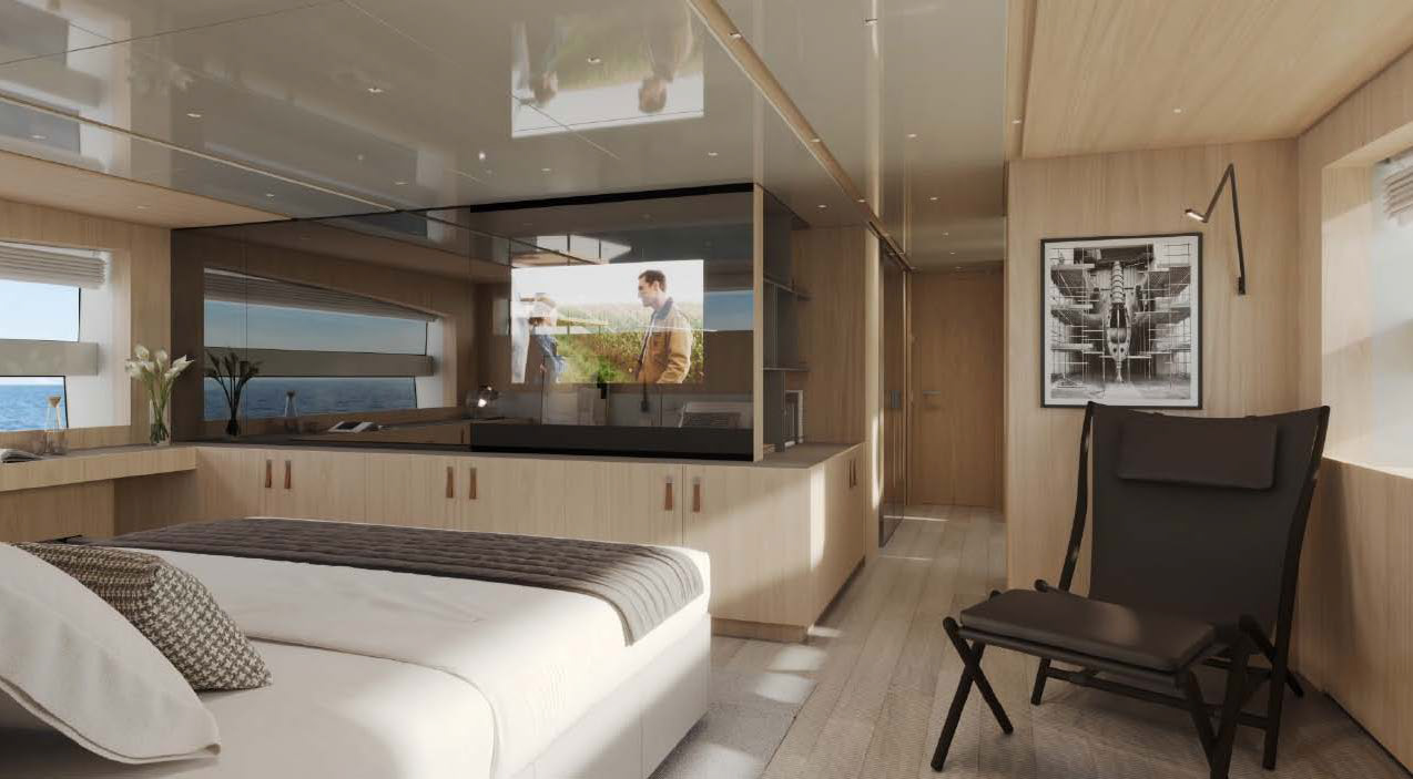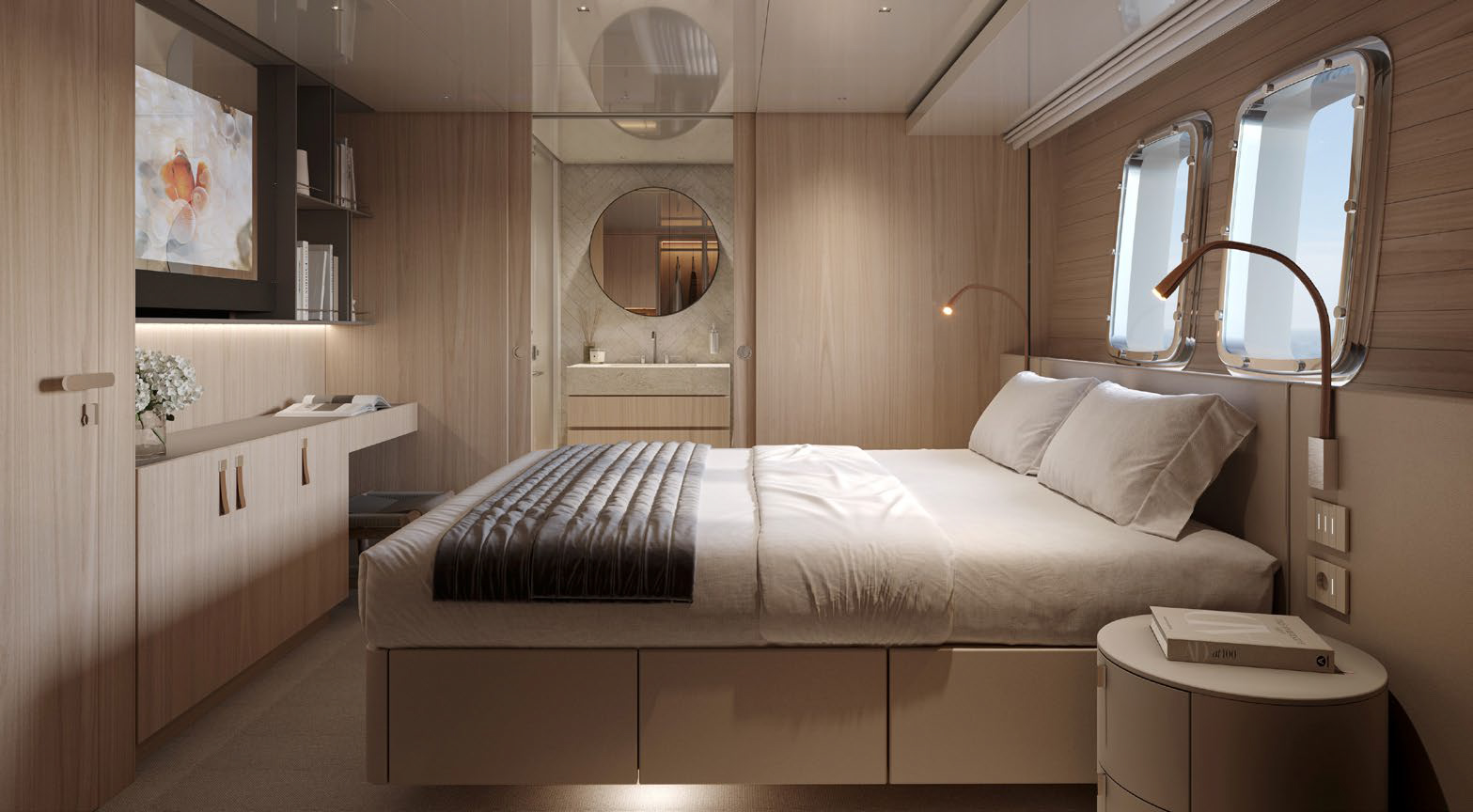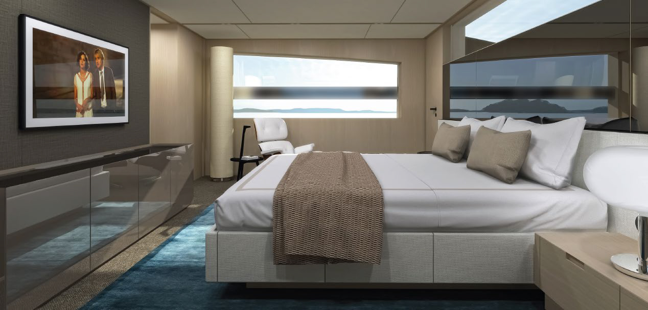 This widebody concept enhances onboard living, allowing the SL110A to accommodate ten guests across five generous cabins. Among them is an expansive, light-filled full-beam owner’s cabin, which offers stunning 270-degree views through the full-beam and side window.