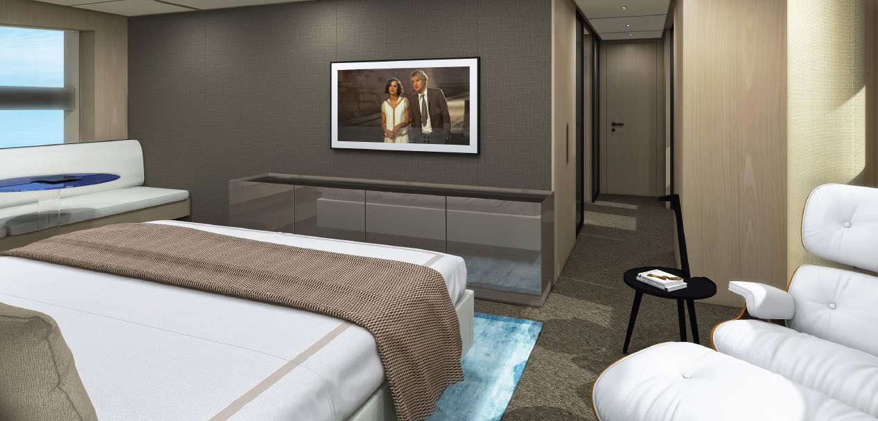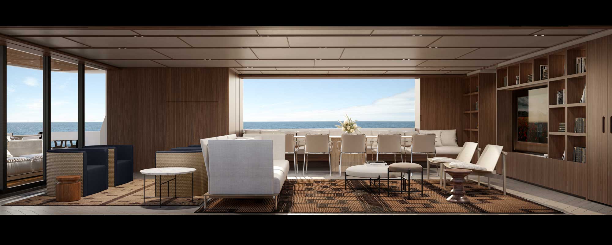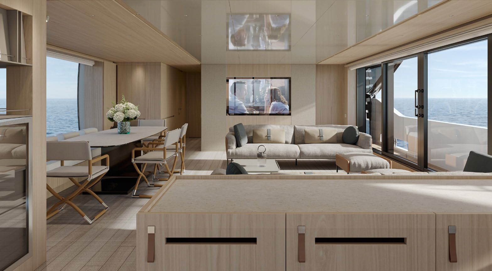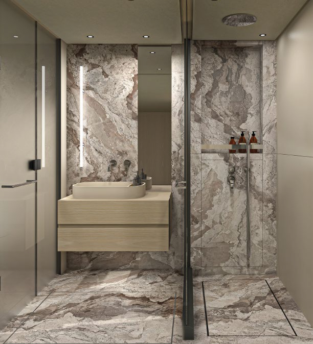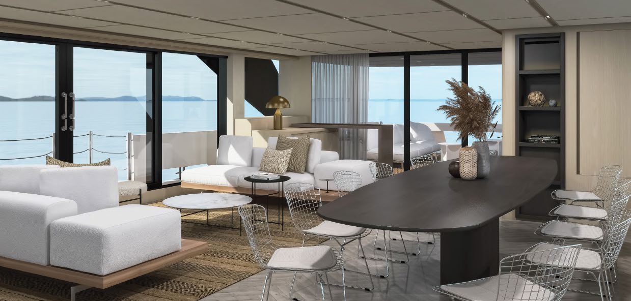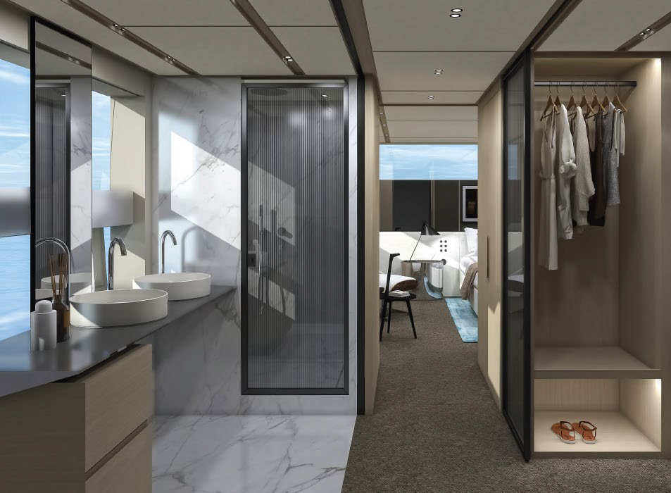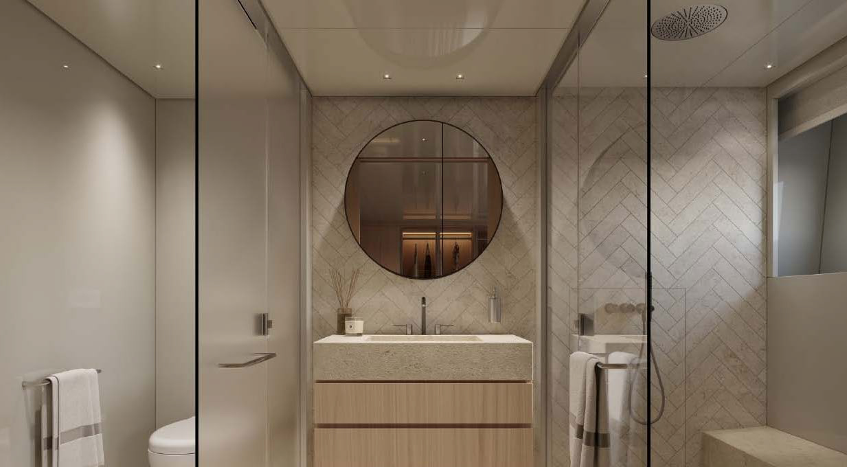 This widebody concept enhances onboard living, allowing the SL110A to accommodate ten guests across five generous cabins. Among them is an expansive, light-filled full-beam owner’s cabin, which offers stunning 270-degree views through the full-beam and side window.
