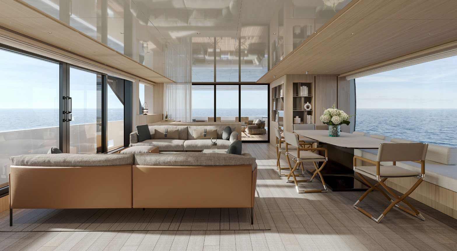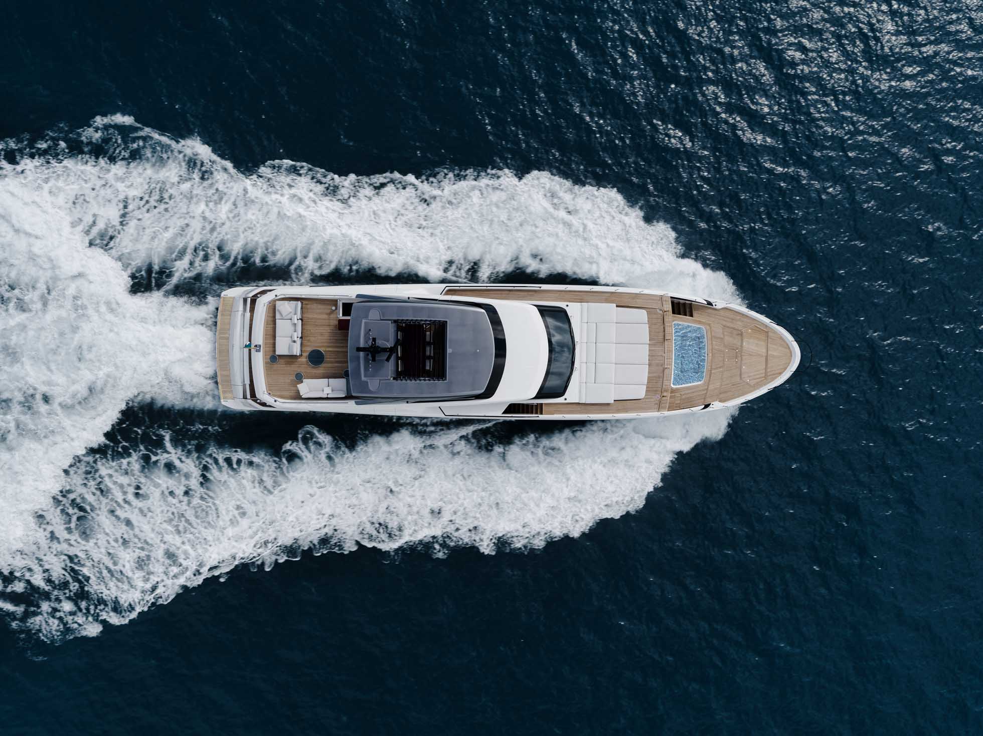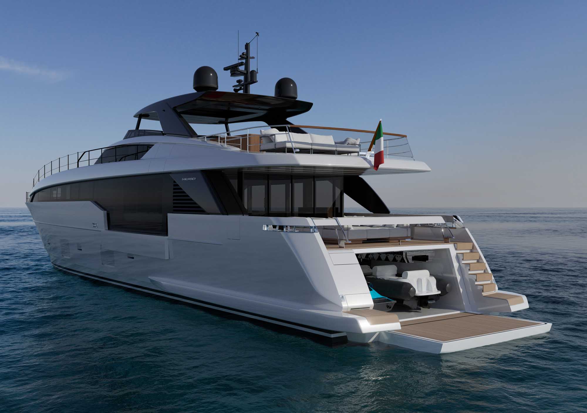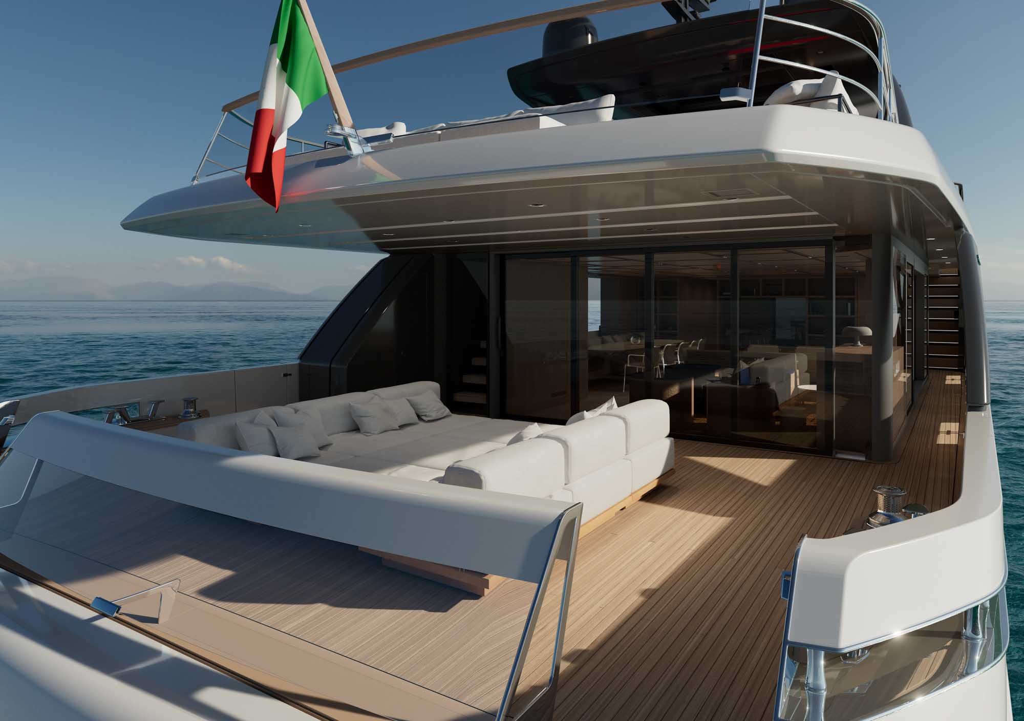 At the stern, the next-generation transom features a garage designed to house both a tender and a Jetski. The flush transom includes hidden folding stairs and transforms into a spacious bathing platform with easy steps up to the cockpit.