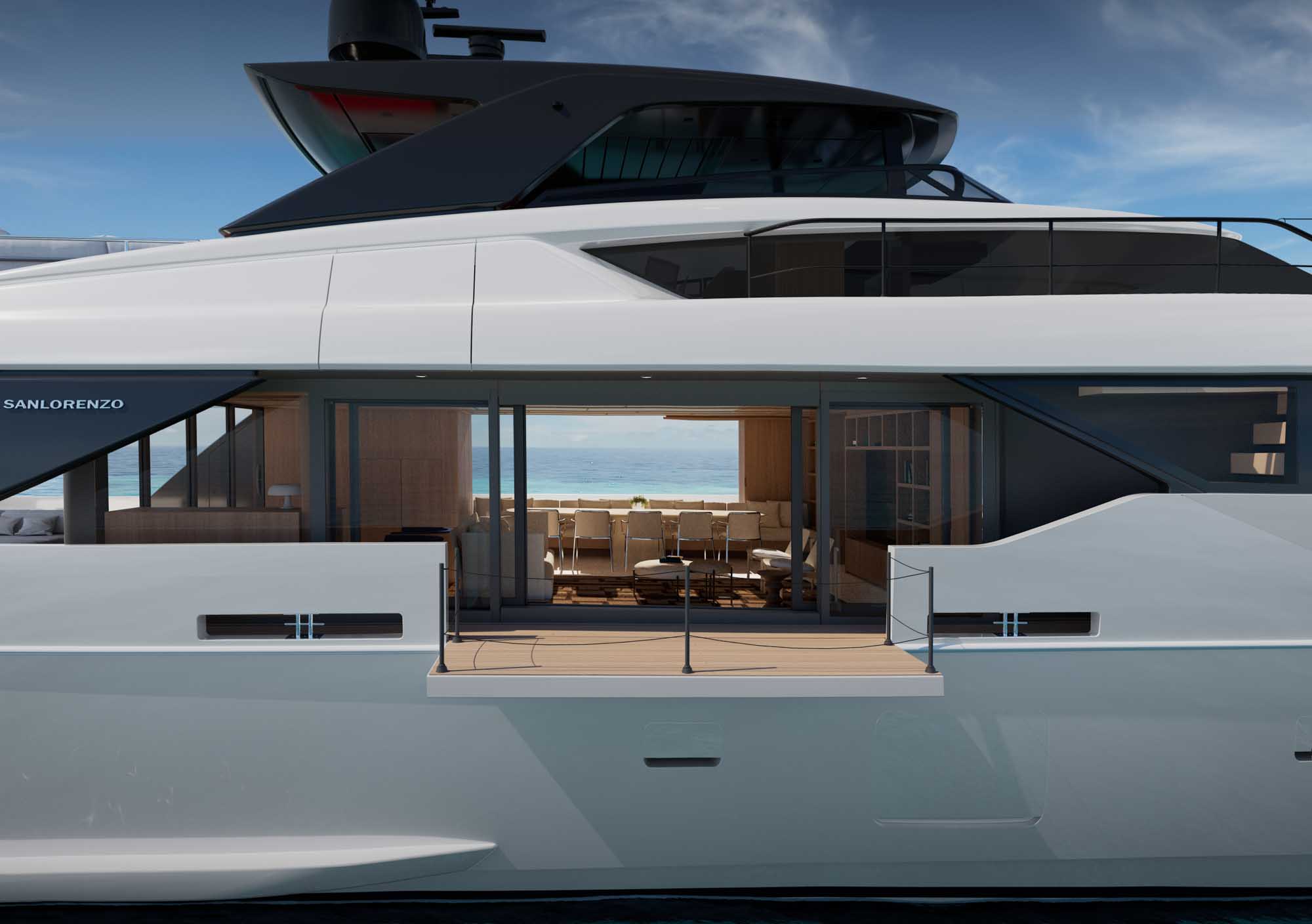In this next-generation model of the popular SL Series, Sanlorenzo’s bold Asymmetric approach reimagines traditional yacht design by raising the port side deck to a higher level. This innovative layout significantly increases the interior volume to approximately 235 GT and strengthens the connection to the sea, with floor-to-ceiling windows and side-opening doors that lead to a spacious drop-down side terrace.