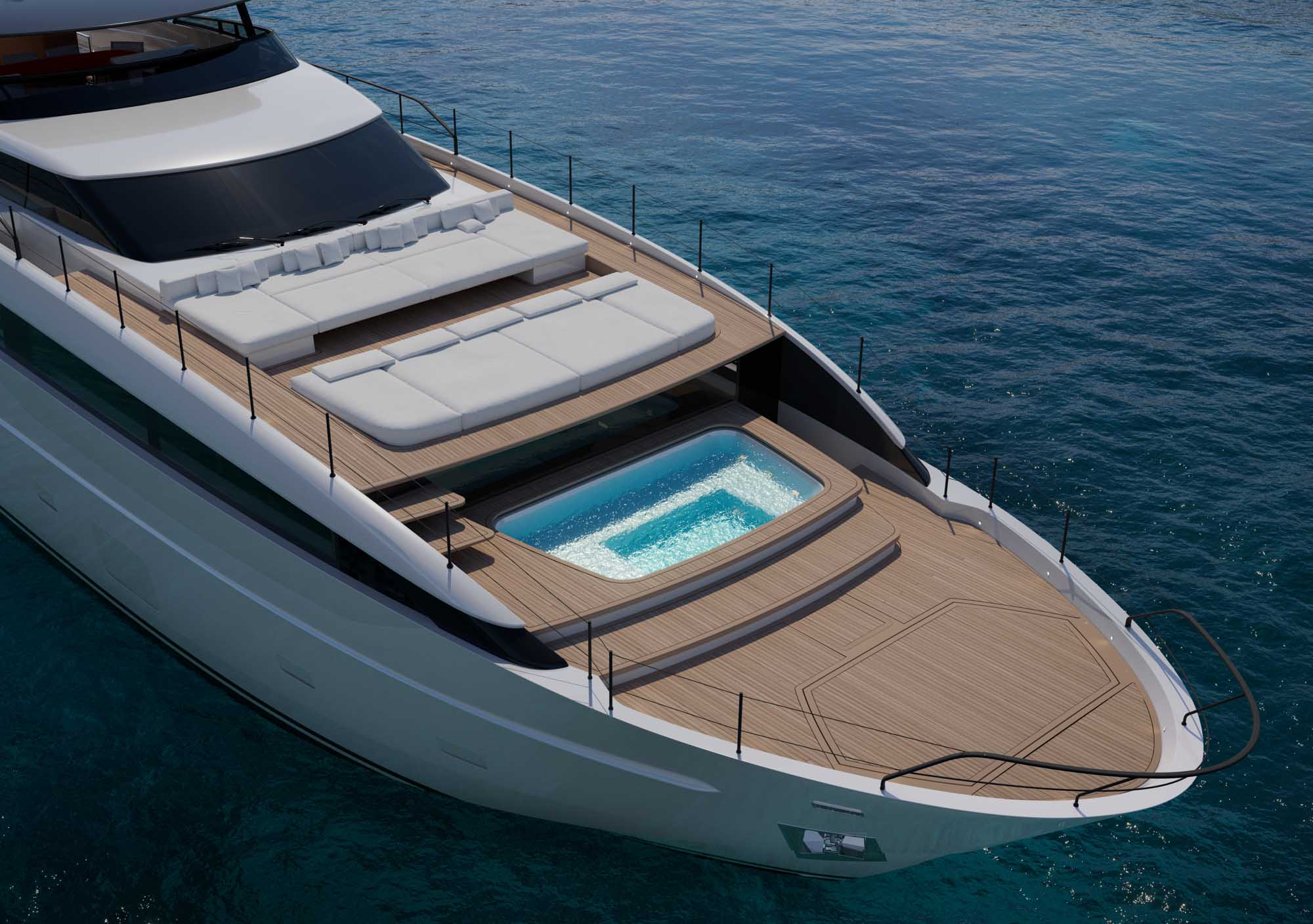 From the owner’s suite, a private entrance provides discreet access to the Jacuzzi, which connects via steps to the vast and fully customisable foredeck. This forward outdoor entertainment area is outfitted with large sunpads and an integrated seating arrangement, complete with ample table space for drinks or casual dining.