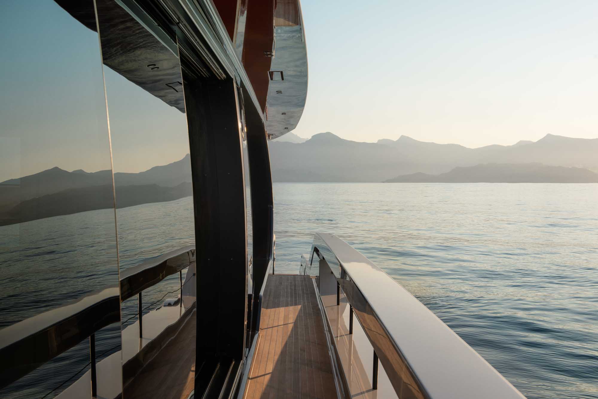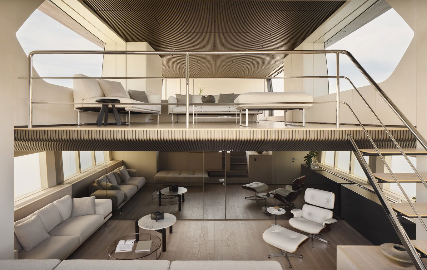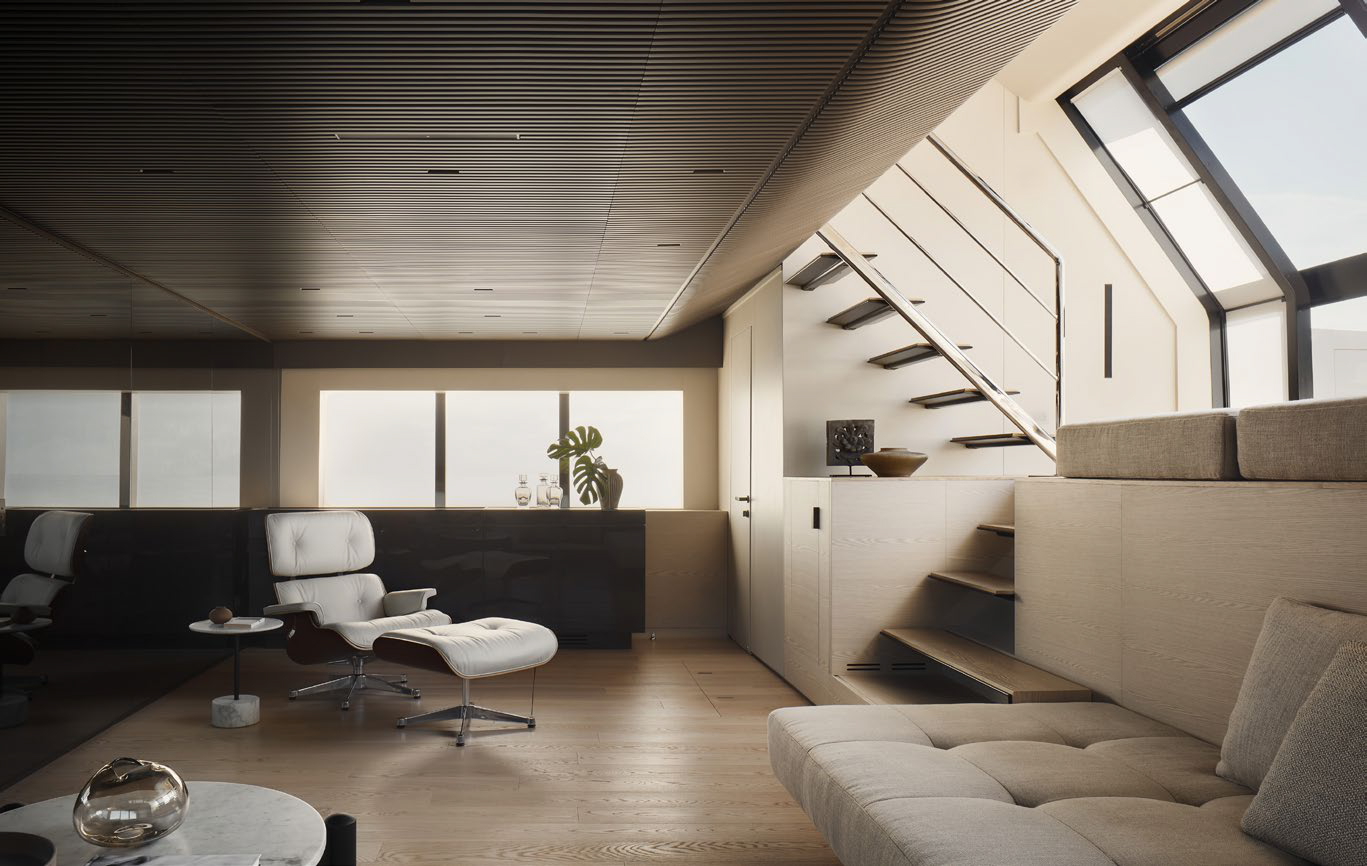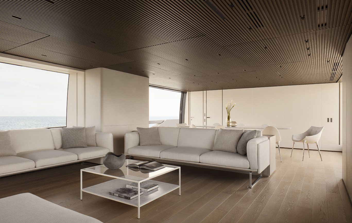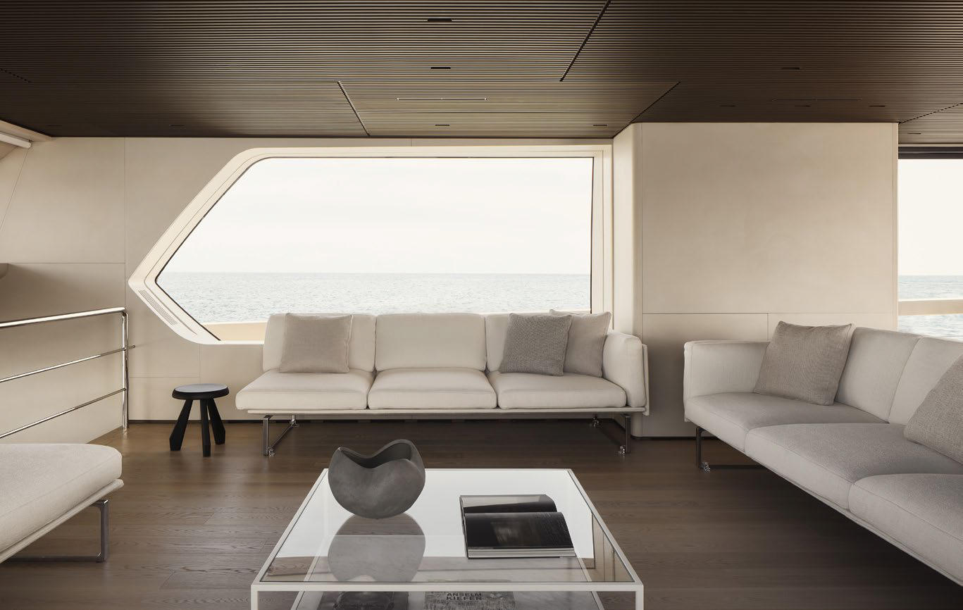 Its innovative design features large sliding doors in the main saloon, providing a direct line of sight from the passerelle into the yacht’s cavernous double-height, loft-inspired interior - a remarkable fusion of space and light.