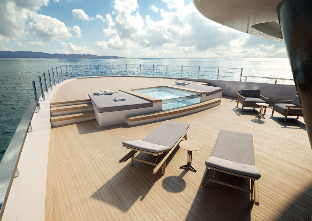 At the stern, the beach club opens on three sides to create a floating terrace, complete with bar, hammam, gym, and beauty salon – a space designed for connection to the sea through light, silence and simplicity.