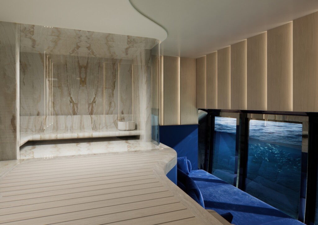 Ahead lies the Aquarium, approximately 35 sqm within the wellness area comprising hammam, sauna, massage room, cryotherapy and posarium, with an opening terrace. A partially submerged glazed section of the hull transforms the side shell into a window below the waterline. Seated inside, guests experience the marine landscape flowing silently beyond the transparency of steel and glass.