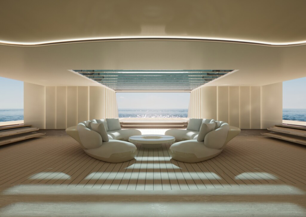 Virtuosity introduces several features never seen on a yacht: a living tree rising through two decks, a submerged aquarium carved directly into the hull, a transformative Ocean Resort and a reflecting pool designed as an atmospheric architectural element.