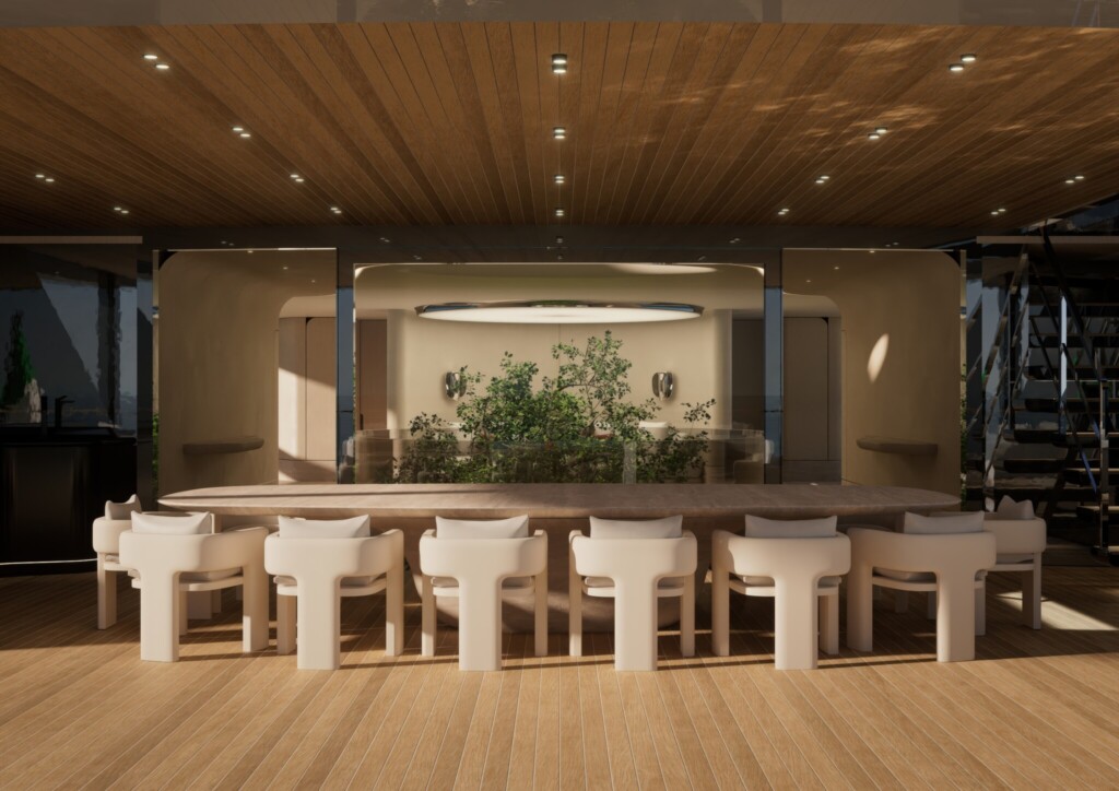 Such an approach reflects a design vision in which nature and naval architecture engage in a genuine, responsible dialogue. By integrating natural elements through scientifically informed choices and controlled environmental management, the project reinforces its commitment to sustainability – promoting a balanced relationship between technological innovation, ecological resilience, and long‑term environmental stewardship.