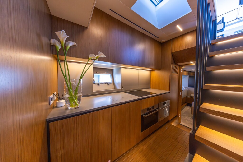 At the bow, the foredeck offers forward-facing seating and sunpads – a tranquil escape for morning coffee or sun-soaked afternoons. Meanwhile, the beach club embodies the yacht’s spirit of adventure. With an integrated pantograph step passarelle, wet bar with fridge and teppanyaki grill, and handheld shower, it’s the ideal setting for relaxed days at anchor. The hydraulic swim platform with 400kg lift capacity ensure easy sea access and tender handling.