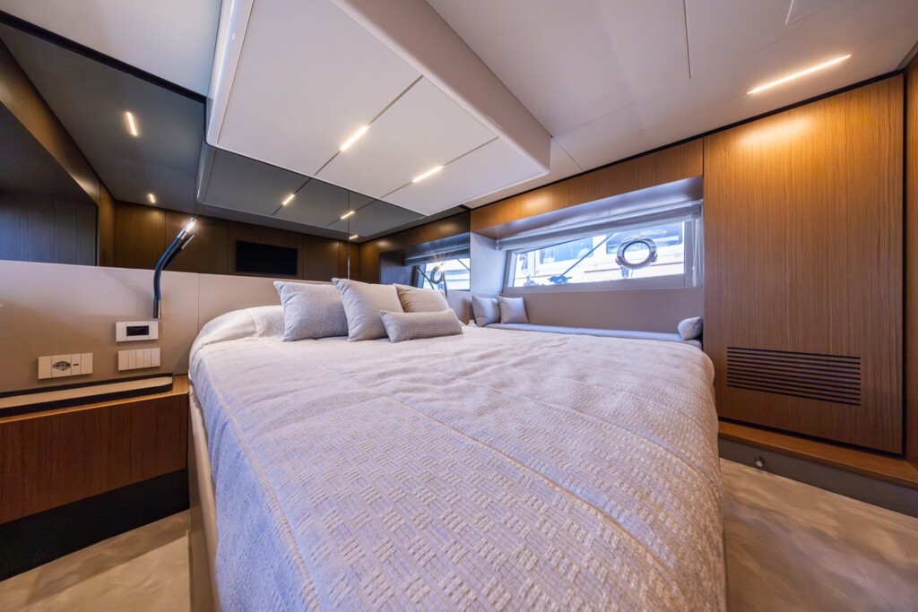 VIP cabin: The forward VIP suite offers a welcoming retreat for guests, complete with a double bed, twin wardrobes, and its own ensuite bathroom that doubles as a day head. Every detail – from the 32” TV to the thoughtful storage – has been crafted for understated luxury.