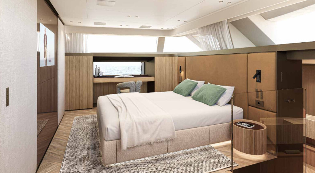Forward, the full beam owner’s cabin offers notably generous proportions with an architectural character all its own. Here, palettes, materials, and textures can be curated to evoke any mood: serene coastal retreat, ultra-modern suite, or warm residential sanctuary. The space can be personalised not only aesthetically but conceptually, reflecting how you want to wake, relax, or retreat while at sea.